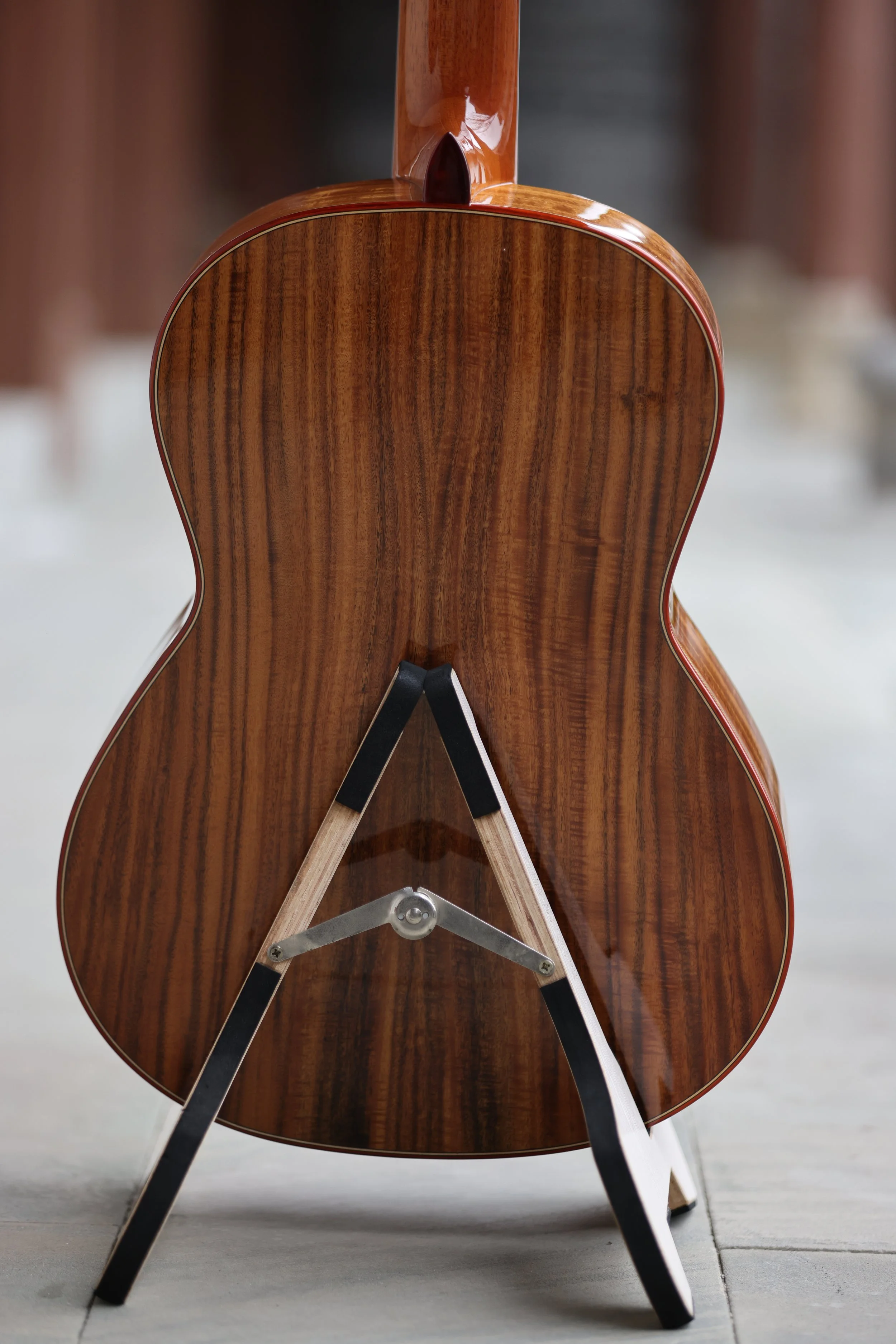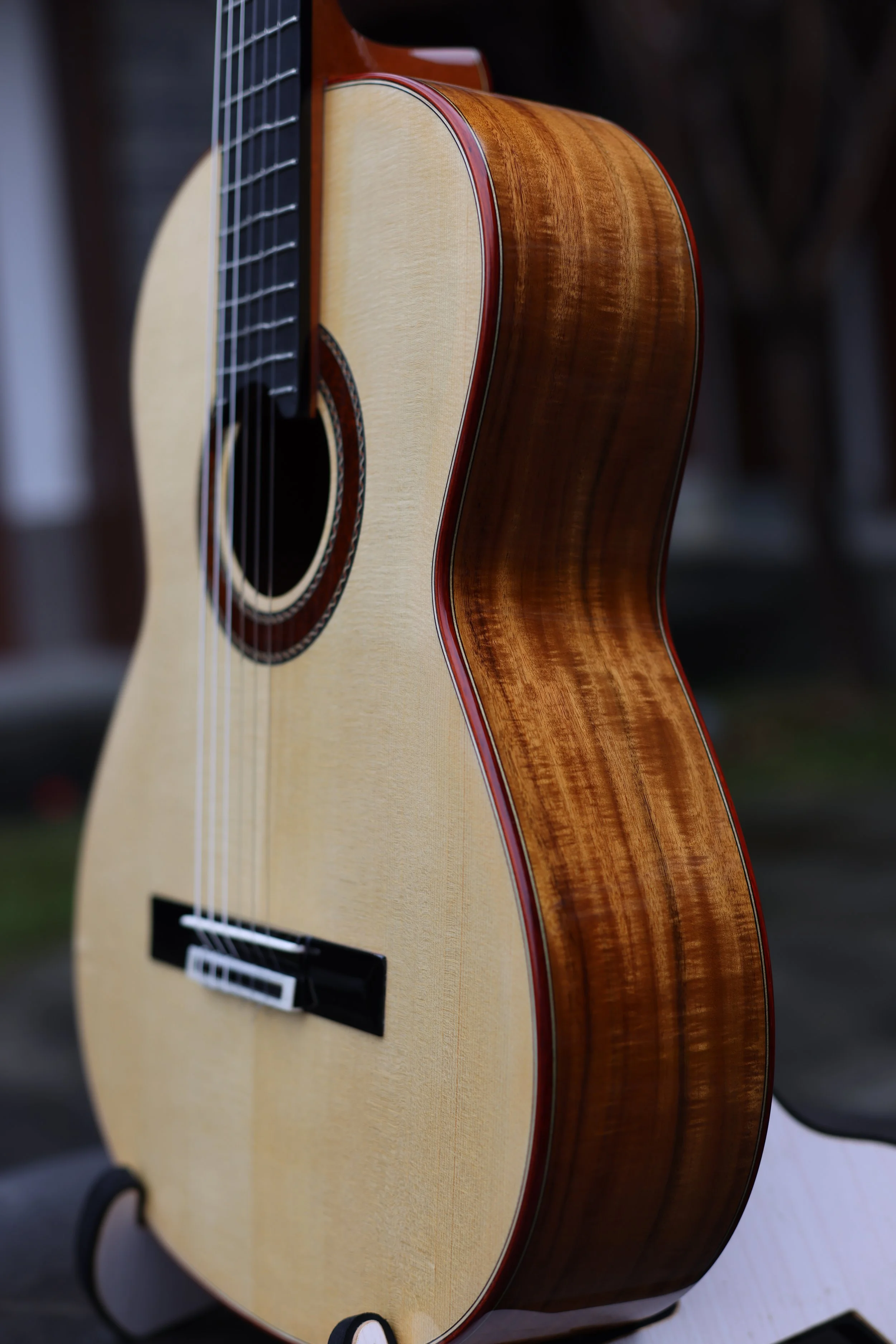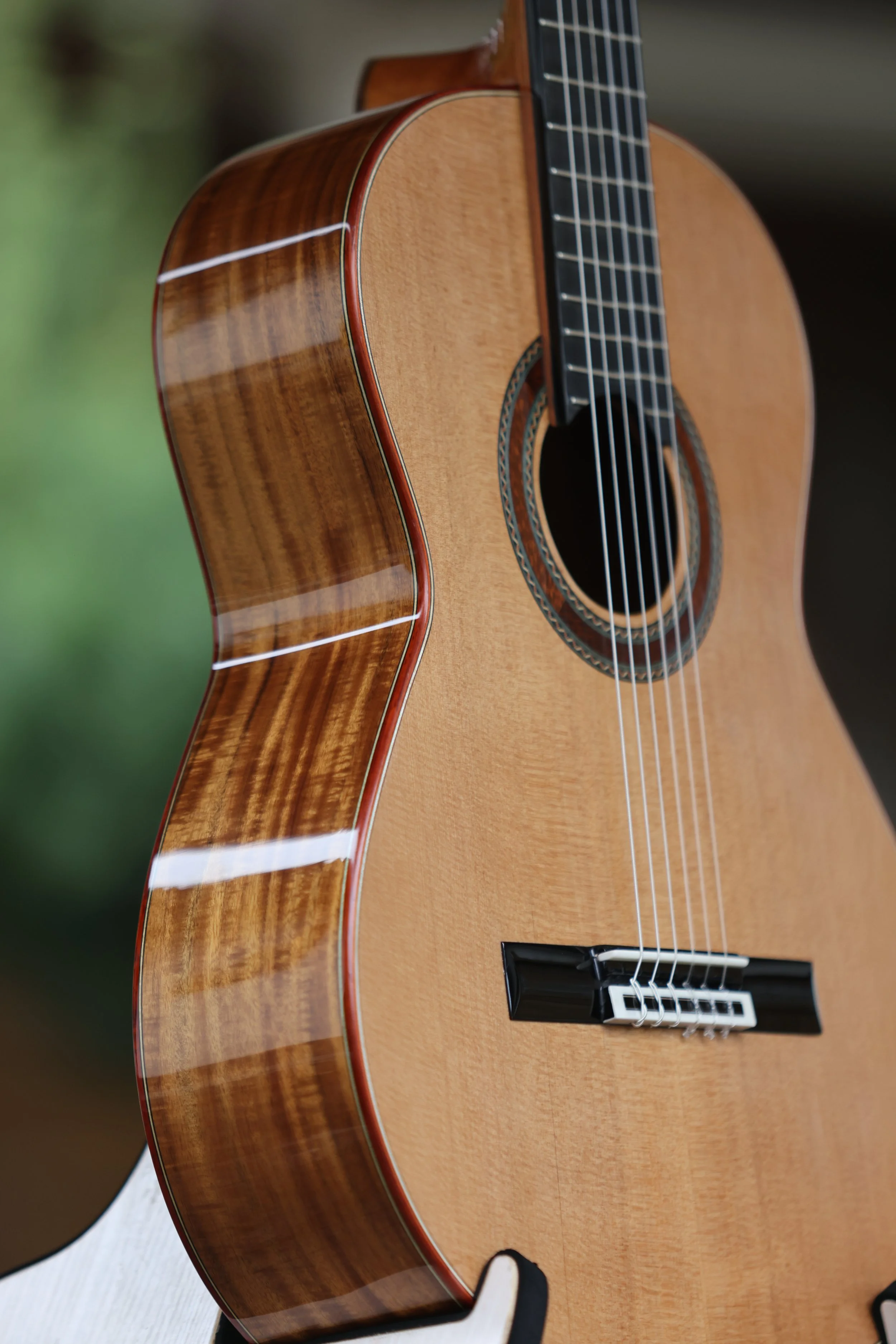 The 2025 edition features double-top construction with snakewood rosettes. The back and sides are crafted from koa wood, one of Mr. Guo’s specialties. More than almost any other luthier we know, he has mastered the use of unconventional tonewoods. The result is not only visually striking: the projection, clarity, and articulation of these guitars are truly remarkable.